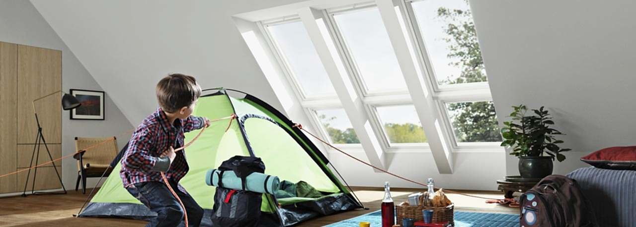 Büyük VELUX çatı pencerelerinin grup halinde kullanılması odanızın göz alıcı bir şekilde ışıkla dolmasını sağlar ve oda içinde dış mekan hissi yaratır. VELUX çatı pencereleri kombinasyonlarını kullanarak harika bir manzaraya ve daha fazla gün ışığına sahip olabilir, evinize kendine özgü bir karakter katabilirsiniz.